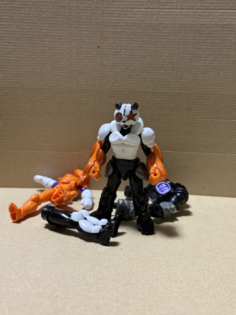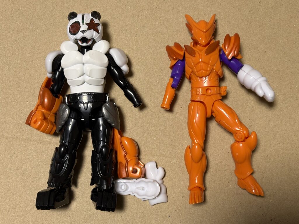 ●「装動 仮面ライダーガヴGV4」の「ガヴ オーバーモード」の腕は取り外せて組み換えることができることを知ったので、                 「装動 仮面ライダーリバイス8」の「仮面ライダーバイス ブラキオゲノム」の下半身と「装動 仮面ライダーガヴGV1」の「仮面ライダーガヴのふわまろフォーム」の上半身(頭部は仮面ライダーダパーンマグナム)を組み替える。